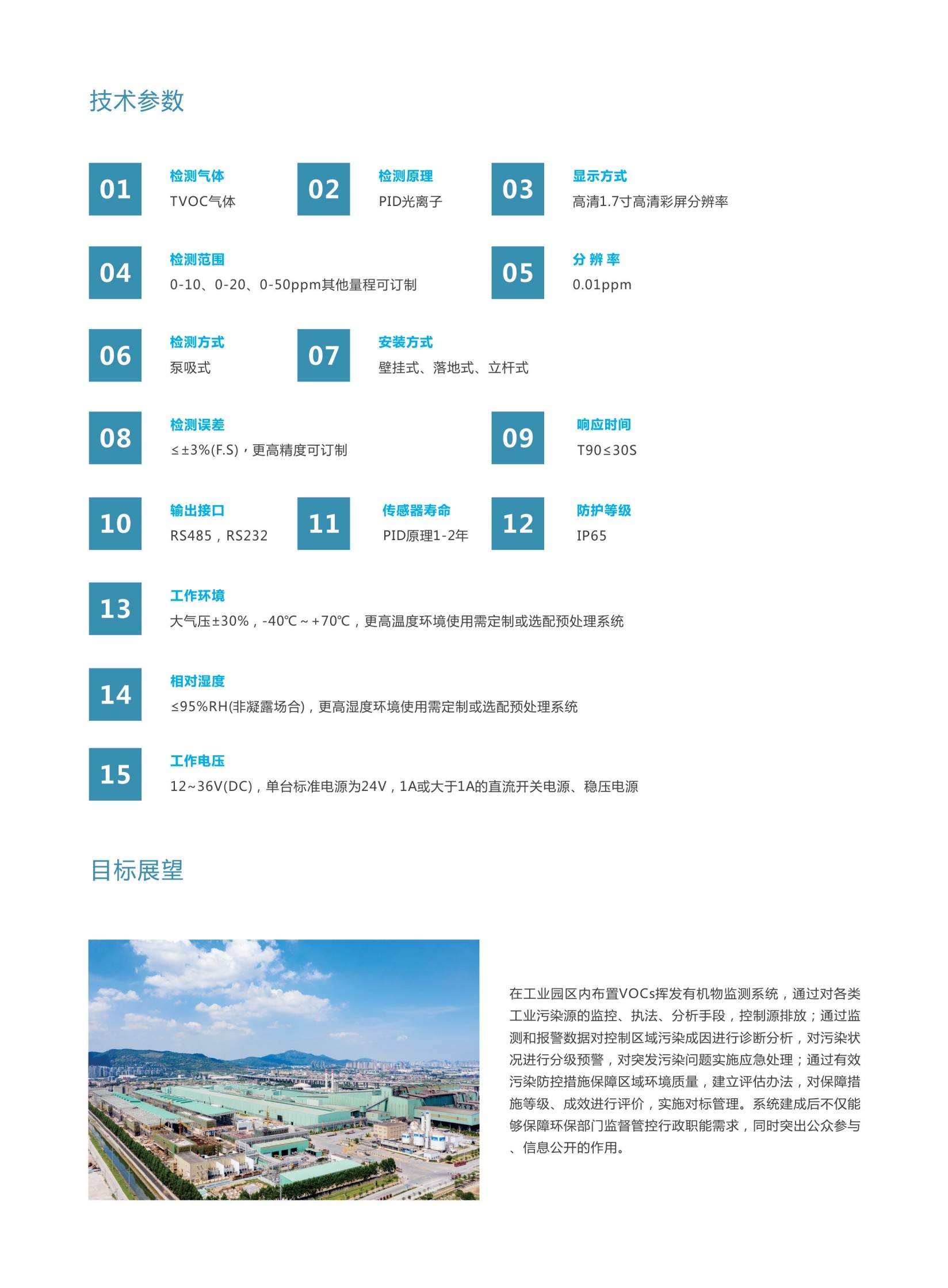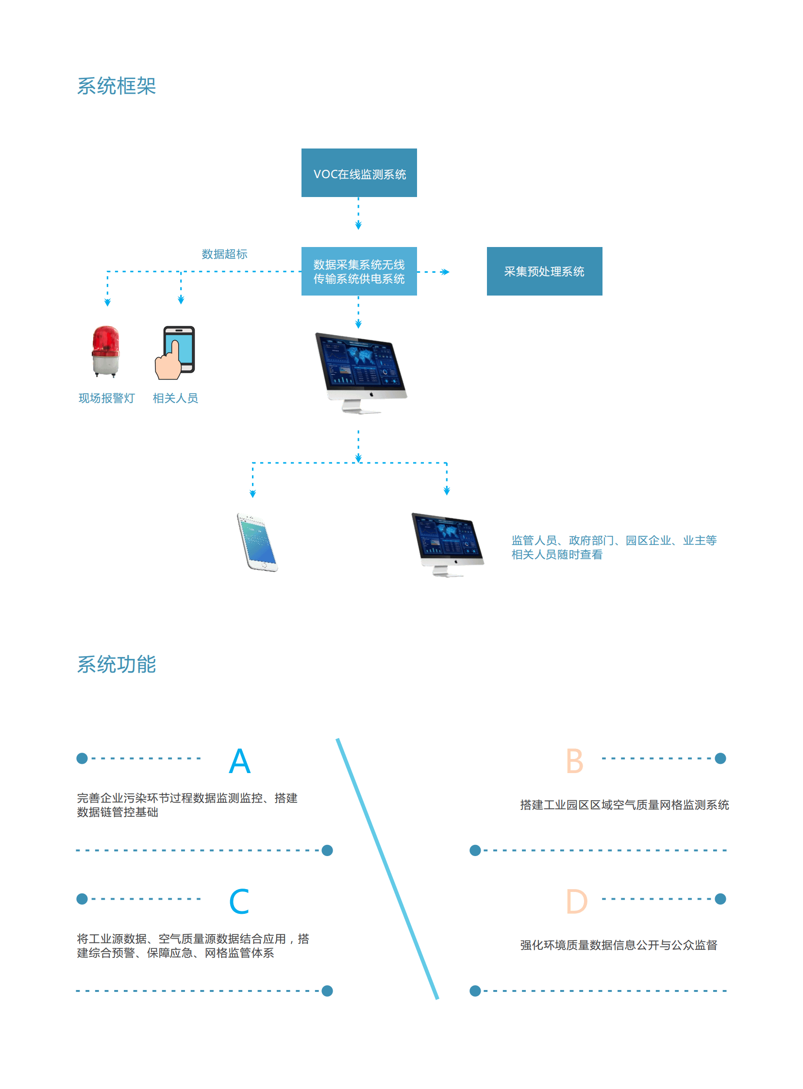 vOCs挥发有机物监测系统应用于vOC气体浓度检测及vOC气体浓度超标报警,可以精确检测大气VOC气体浓度并可多样化(触摸屏或LED屏)显示VOC气体实时浓度值,数据超标声光报警,采用无线监测技术,网格化精细布点,全天候全面监测大气污染情况,实现区域内大气污染监因子全面覆盖,具有标准信号输出,信号稳定,灵敏度及精度高等优点。