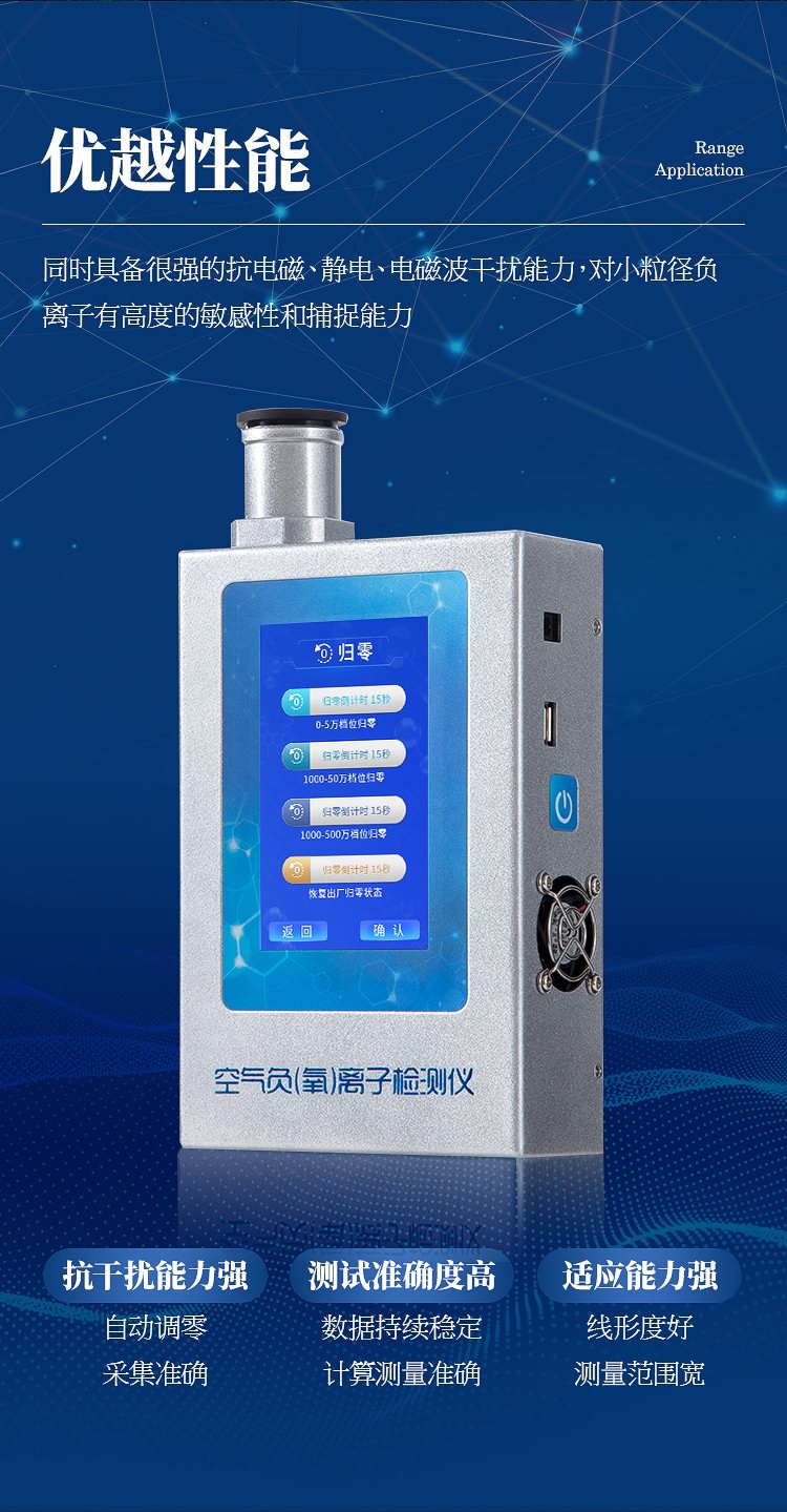 多功能负氧离子检测仪是一款高精度、专业型空气负离子、甲醛、pm2.5、pm10、空气温湿度检测分析仪器。采用先进的圆筒电容结构负(氧)离子捕获机制,将大气中所含有负(氧)离子捕获,然后通过独有算法,进行精确统计计算。具备测量过程稳定,反应迅速,测量结果准确等优点。同时具备很强的抗电磁、静电、电磁波干扰能力,对小粒径负离子有极佳的敏感性和捕捉能力,整体性能优越。