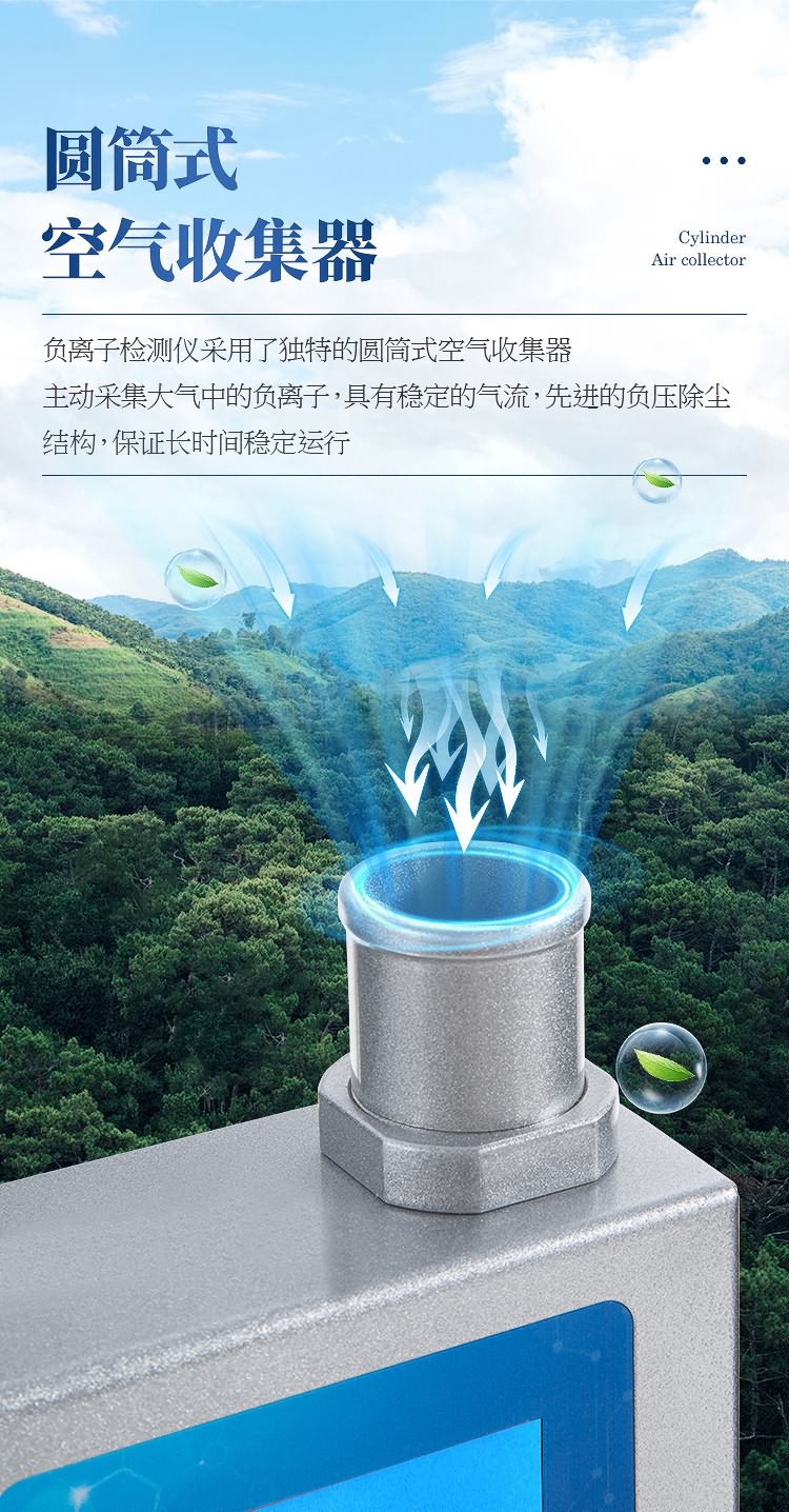 采用“电容式吸入法”原理进行负离子检测,测量空气中的负离子浓度值。在离子传感器(或称采集桶、采集筒)的极化板(或称偏压板)上加载定量的极化电压,再让被测空气按设定速度匀速通过传感器。空气中特定的小粒径负离子在电场的作用下发生偏转,被采集板所捕获。采集到的负离子负电荷量经过采集器的处理,即可计算出负离子的电荷浓度值。