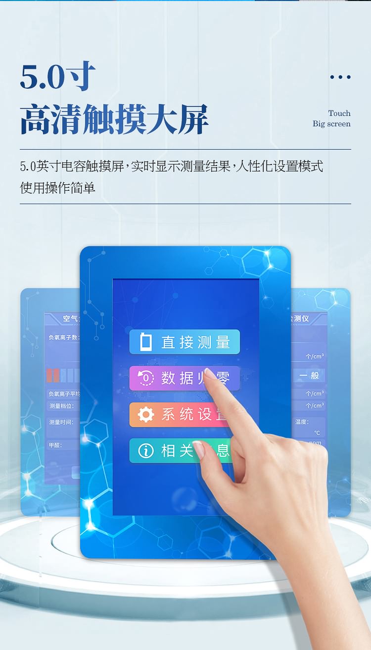 多功能负离子检测仪操作简单,5.0英寸全彩大屏显示实时测量数据、仪器工作状态、自动计算平均值。操作人员零基础无需专业培训也可快速测量。