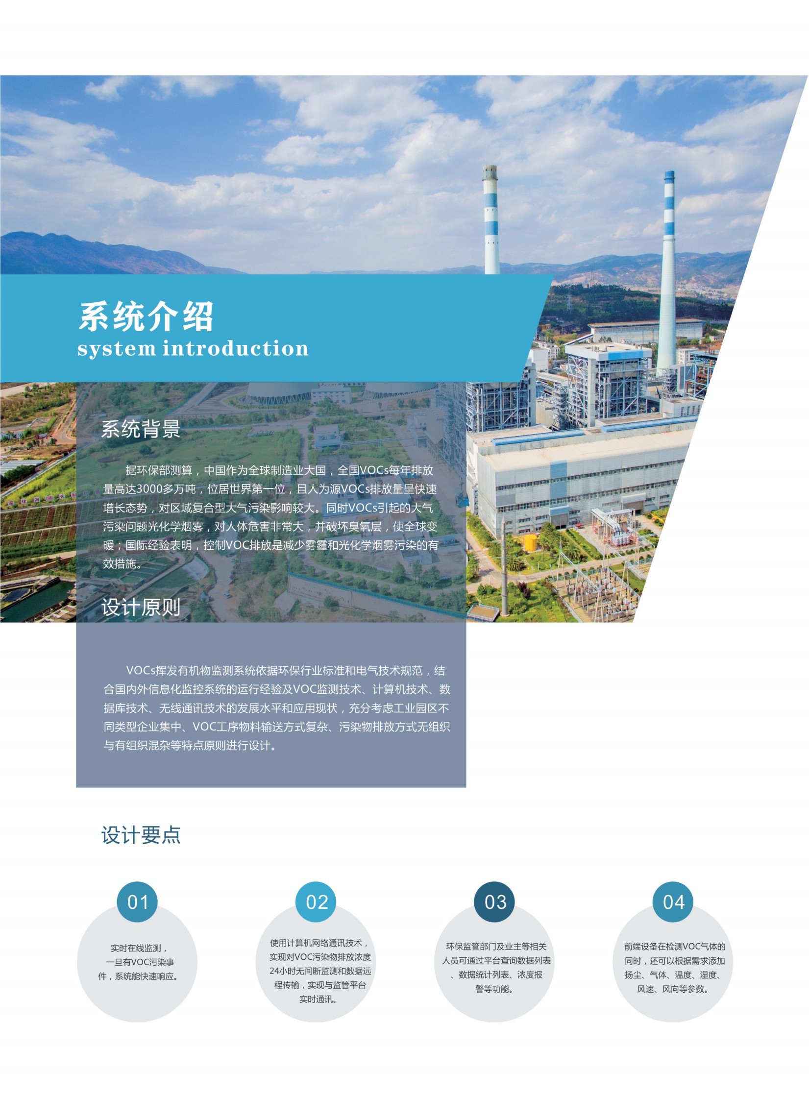 vOCs挥发有机物监测系统依据环保行业标准和电气技术规范,结合国内外信息化监控系统的运行经验及VOC监测技术、计算机技术、数据库技术、无线通讯技术的发展水平和应用现状,充分考虑工业园区不同类型企业集中、VOC工序物料输送方式复杂、污染物排放方式无组织与有组织混杂等特点原则进行设计。