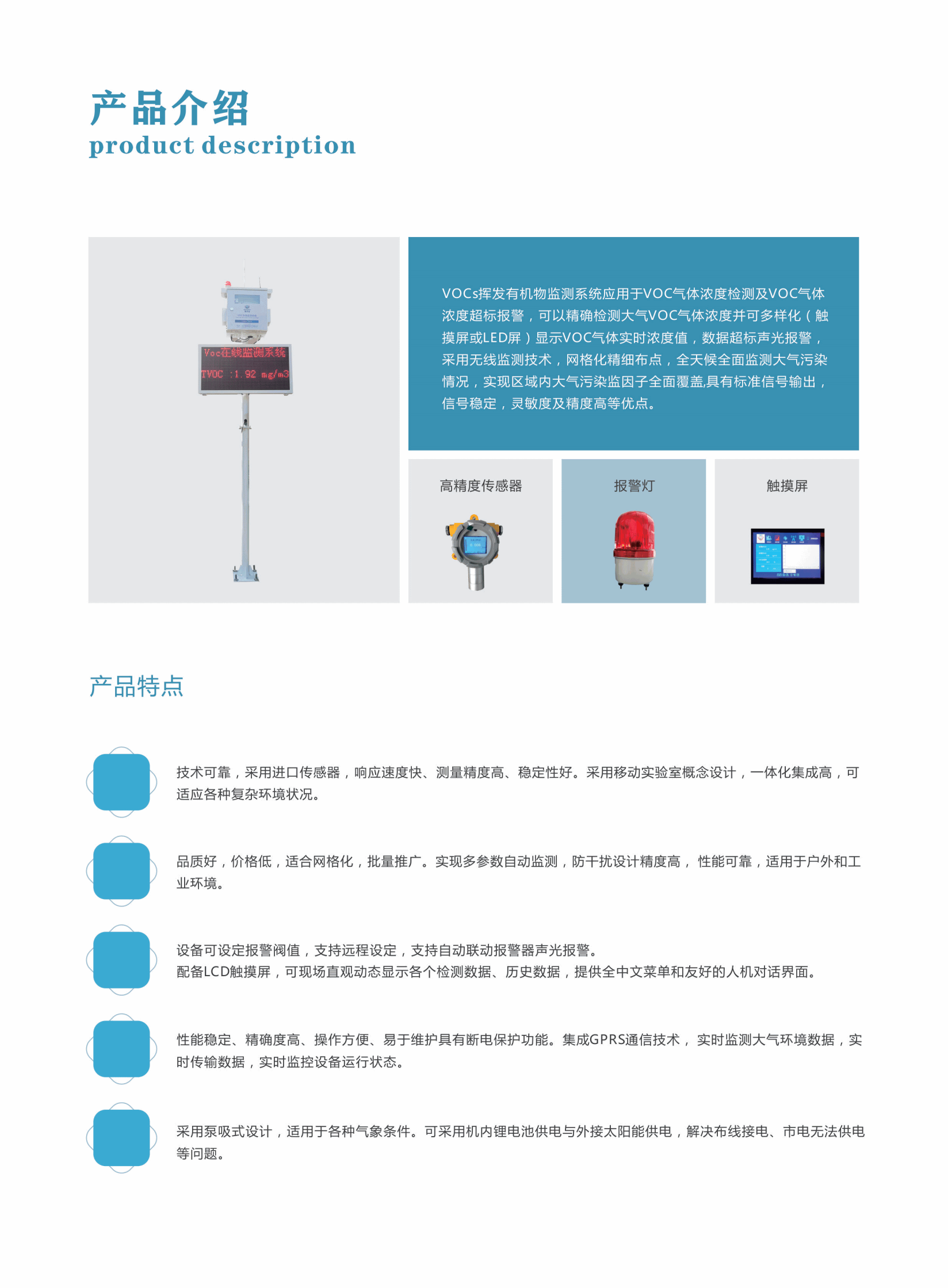vOCs挥发有机物监测系统应用于vOC气体浓度检测及vOC气体浓度超标报警,可以精确检测大气VOC气体浓度并可多样化(触摸屏或LED屏)显示VOC气体实时浓度值,数据超标声光报警,采用无线监测技术,网格化精细布点,全天候全面监测大气污染情况,实现区域内大气污染监因子全面覆盖,具有标准信号输出,信号稳定,灵敏度及精度高等优点。