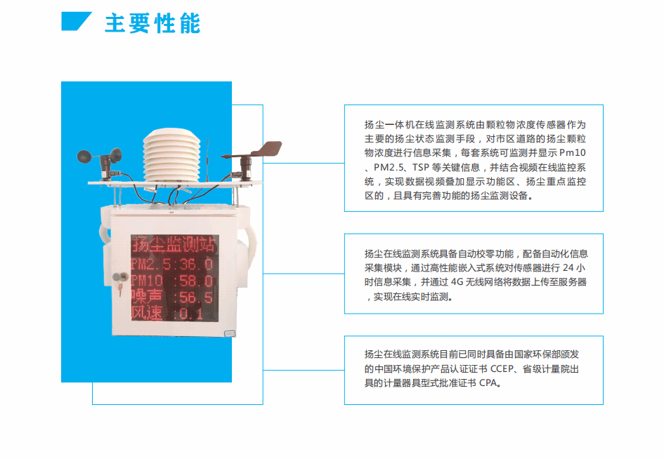扬尘在线监测系统目前已同时具备由国家环保部颁发的中国环境保护产品认证证书CCEP、省级计量院出具的计量器具型式批准证书CPA。