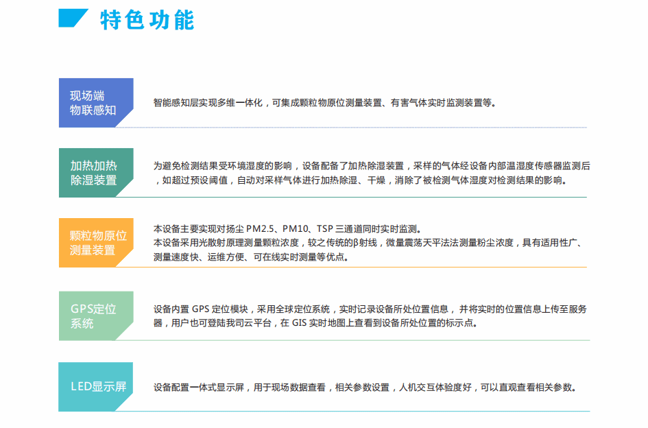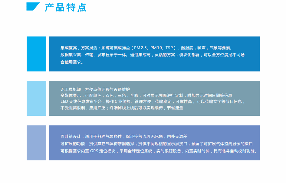 扬尘一体机在线监测系统由颗粒物浓度传感器作为主要的扬尘状态监测手段,对市区道路的扬尘颗粒物浓度进行信息采集,每套系统可监测并显示Pm10、PM2.5、TSP等关键信息,并结合视频在线监控系统,实现数据视频叠加显示功能区、扬尘重点监控区的,且具有完善功能的扬尘监测设备。